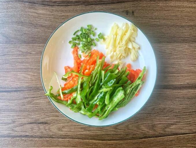 【第一步】:将青红椒洗净去籽,然后将青红椒切成细丝,蒜拍碎切末,将切成姜丝,小葱切成葱花,分别装在盘中备用。