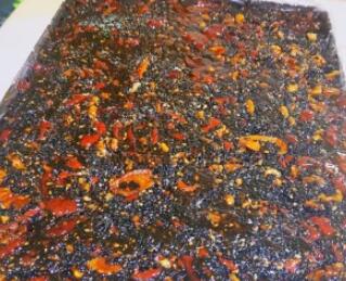 15.搅拌好 慢慢倒在模具里,带一次性手套,手套要抹上香油 把阿胶糕压平整。