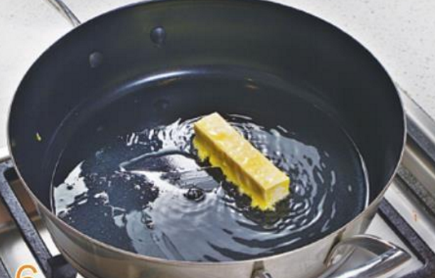 5 裹好干淀粉的豆腐放入蛋黄液中裹匀。