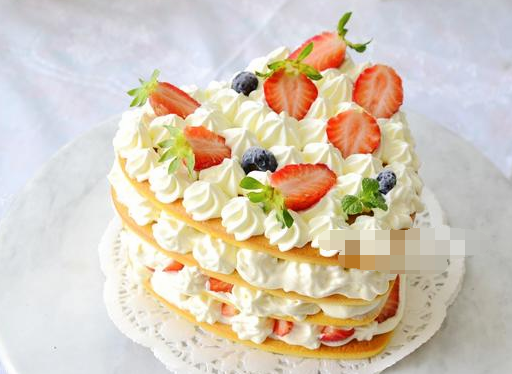 6、取一片抹上淡奶油,放上草莓片,如此反复将3片都处理好,最后盖上第四片蛋糕,挤上奶油花,放上草莓和蓝莓装饰即可