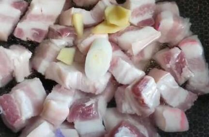 锅中多放入一些凉水,把五花肉下入锅中,再加入葱、姜、料酒去腥,大火烧开煮5到6分钟。