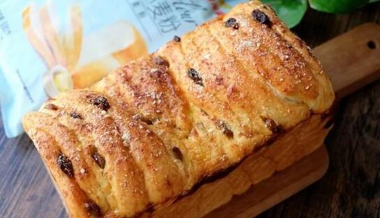 掰开面包,里面还有香甜的葡萄干,我是很喜欢在面包里放点葡萄干或蔓越莓干之类的果干的,可以丰富面包的品感,更好吃也更香。如果不喜欢葡萄干,可以省略,或者换成其它的原料。