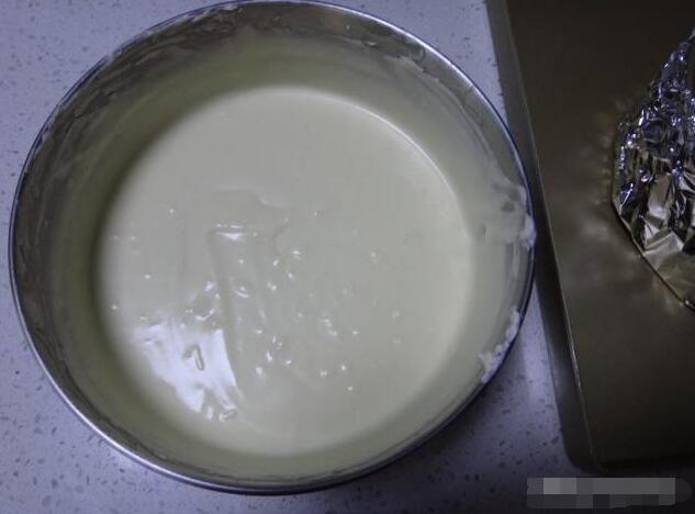 7、加入香草精拌匀,最后将泡软的吉利丁片滗去多余水分用微波炉叮化,加入搅匀,奶酪糊就做好了