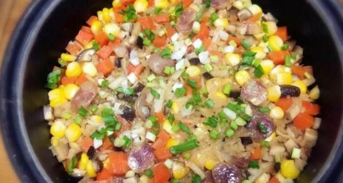 2.然后把准备好的培根切成肉丁,把培根放进锅里。如果我们担心炒培根不香,那么我们也可以把这些香料和培根一起放在炒培根里,然后我们可以在炒完之后再把这些香料挑出来。香味油炸后,我们可以把玉米粒和豌豆放进锅里。然后我们可以把准备好的胡萝卜和青椒洗干净,切成小粒,在锅里搅拌。培根、豌豆、胡萝卜、玉米等蔬菜煮熟后,我们可以把糯米放进锅里。然后搅拌均匀,使糯米能够均匀地吸收这些成分的香味。然后我们加一点酱油给它上色,但在加酱油时要注意不要加太多,否则颜色会特别暗,似乎没有食欲。