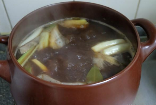 步骤5:砂锅里装上足够的清水,烧热,把步骤4里的配料都放进锅里,再倒入葱姜料酒,或者普通料酒;