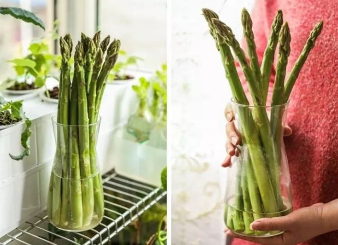 5 、 芦笋的保存:芦笋的清脆与鲜甜是建立在充足的水分之上(芦笋70%都是水分),买回来的芦笋可以将根部泡在水里一段时间使其“喝”饱水分;如果当天来不及食用,也可以直接泡花一样将根部泡在其中,芦笋吸水很厉害,建议加入淹没根部5~10cm的清水。