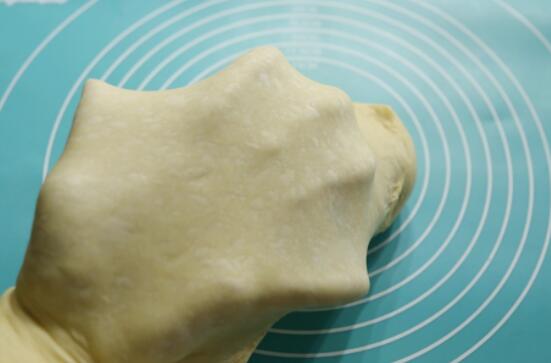 5、然后就是手工揉面快速出手套膜的过程了:将面团放在硅胶垫上,像洗衣服一样用力搓,搓到头后,再将面团竖过来接着搓,如此反复。
