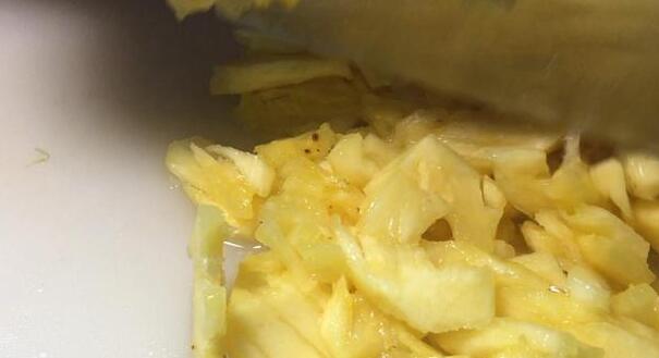 3.翻炒至菠萝的水分收干,这里一定要注意千万别炒过了,要不然菠萝酱就会发苦。
