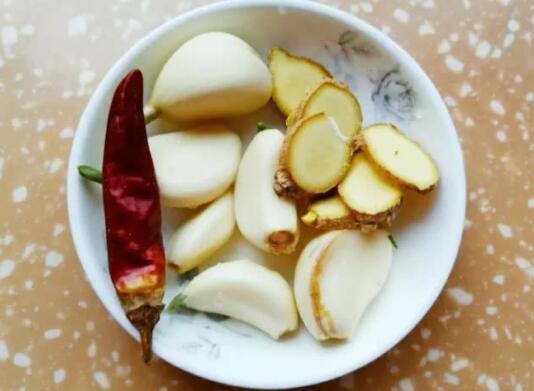 步骤2:把姜,蒜,干辣椒放入盘中备用!