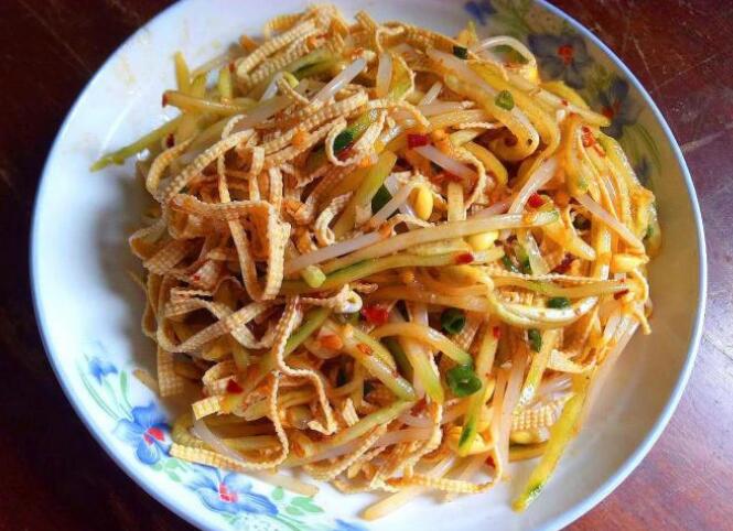 夏季到了,就是女生秀出身材的时候,但是还有很多人还在减肥的道路上,其实减肥不止要运动还得与日常饮食结合。在饮食方面,如果控制食物的摄入,晚餐都只吃水果,非常容易饿肚子,所以还是要吃一些低热量的蔬菜,这里我们建议吃一些凉拌菜,吃一些凉拌菜就不会摄入油脂和热量给身体造成负担,从而达到瘦身的魔都。凉拌菜有很多种,今天就来分享一下由黄瓜,豆腐皮,黄豆芽组成的凉拌菜的做法。