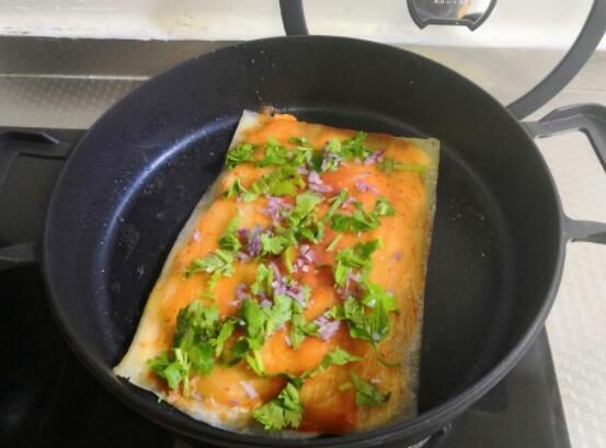 第二步:新思特不粘平底锅烧温热,放入植物油,不要太多,油温上来后,把冷面片上面的保鲜膜撕掉不要,冷面片铺在平底锅里,中小火煎制,看到冷面片中间起小泡,快速翻面,顺锅边淋入一大汤匙清水烹一会,目的是使冷面片回软,口感更筋道