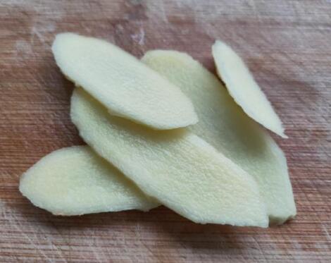 步骤三:生姜去皮洗净,用刀切成薄片。