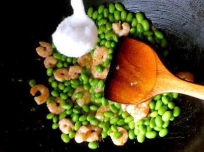 配料:鲜虾400克、青豆350克、盐适量、油适量、料酒适量