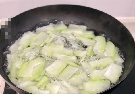 2. 锅中烧开水,放入冬瓜,再次水开后,煮大约2、3分钟,去生即可,不要煮得太软。