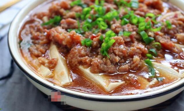 蒸熟的豆腐会渗出一些水分,将其倒掉,铲起煮熟的肉糜和汤汁,浇在豆腐上面,撒点葱花装饰即可。