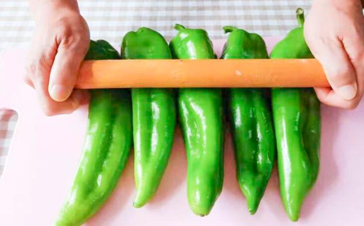 ①把青椒洗干净,把籽取出来,用擀面杖压一下,这样更容易入味也可以更好的杀出水分