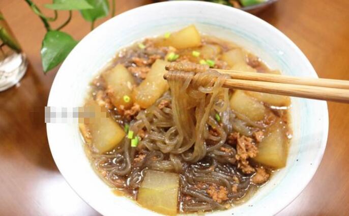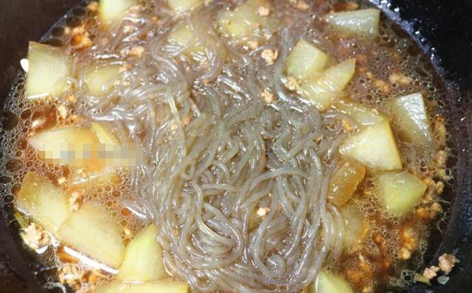 6,可以用筷子扎一下,如果可以轻松扎入,说明冬瓜已经熟了。这时把泡发的粉条倒入锅内,注意这时不要用铲子去搅动,就让粉条盖在冬瓜的上面,这样粉条不会粘锅。盖上锅盖,继续烧2分钟左右。