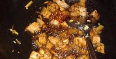 9、翻炒片刻后,加入适量的酱油、料酒、姜一起爆香并爆出五花肉的油。
