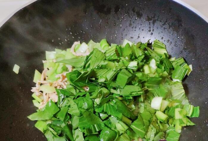 5、倒入切碎的青菜梗与肉丝一起翻炒。