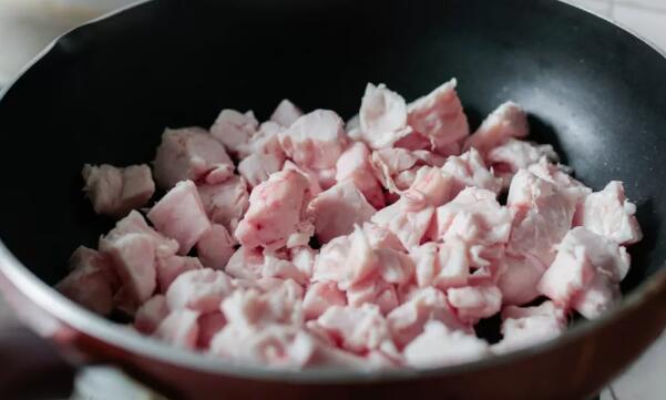 ▼ 2. 熬猪油:果家中有猪油,可以直接进行下一步。没有的话买上猪板油,猪油熬起来(过年可以派大用场)。先把板油切成小块。