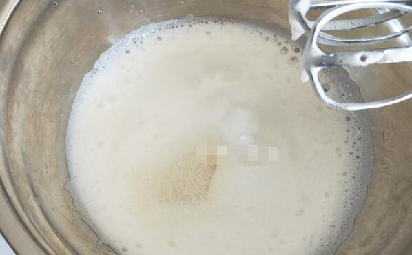 4、蛋清倒入无水无油的盆里,加入几滴柠檬汁或是白醋,可去腥。用打蛋器打发至大泡泡时第一次加入1/3的白糖
