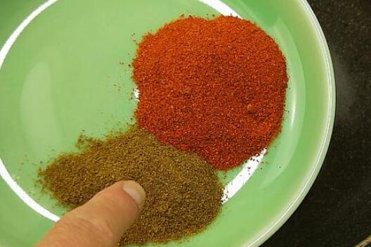 11、把火先关掉后,辣椒面20克,孜然粉5克,放入锅中,用锅里的余温爆出香味